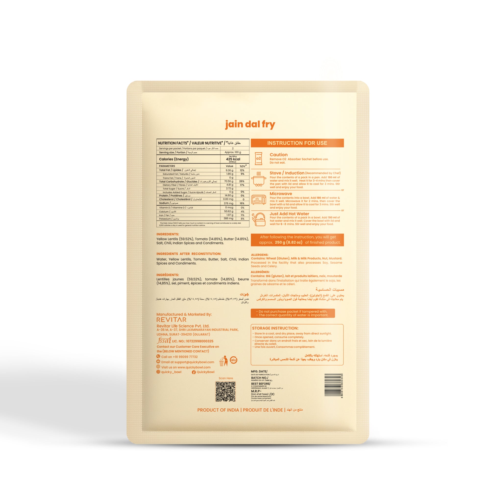 Instantly satisfy your cravings with our Ready-to-Eat Jain Dal Fry Bursting with authentic flavors and ready in minutes. Freeze Dried, Free from Preservatives.