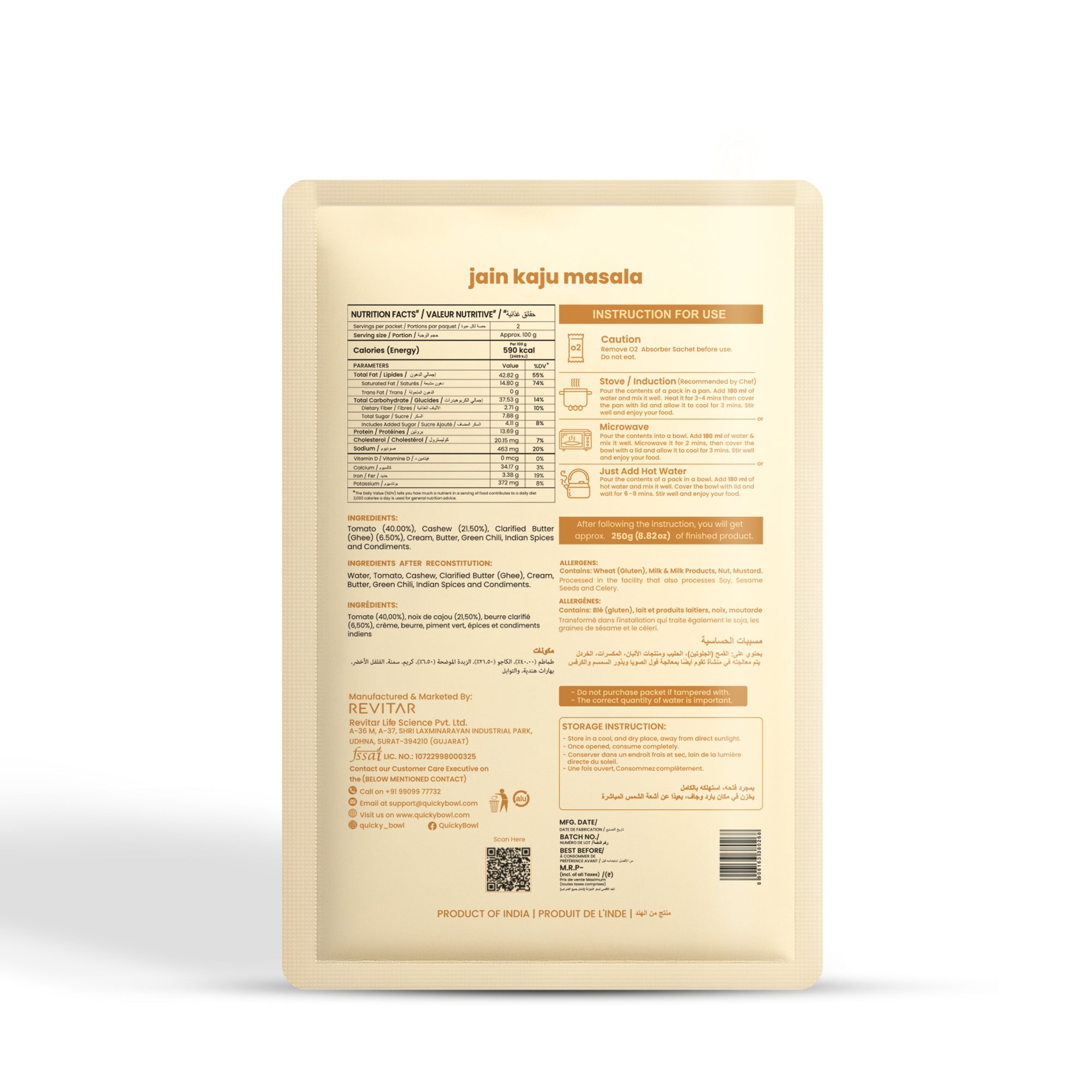 QB Ready To Eat Jain Kaju Masala. This dish is a rich and creamy texture due to the use of cashews and various creamy ingredients. It is a good source of healthy fats, protein, and various vitamins and minerals. The spices in this dish give it a unique and delicious taste.