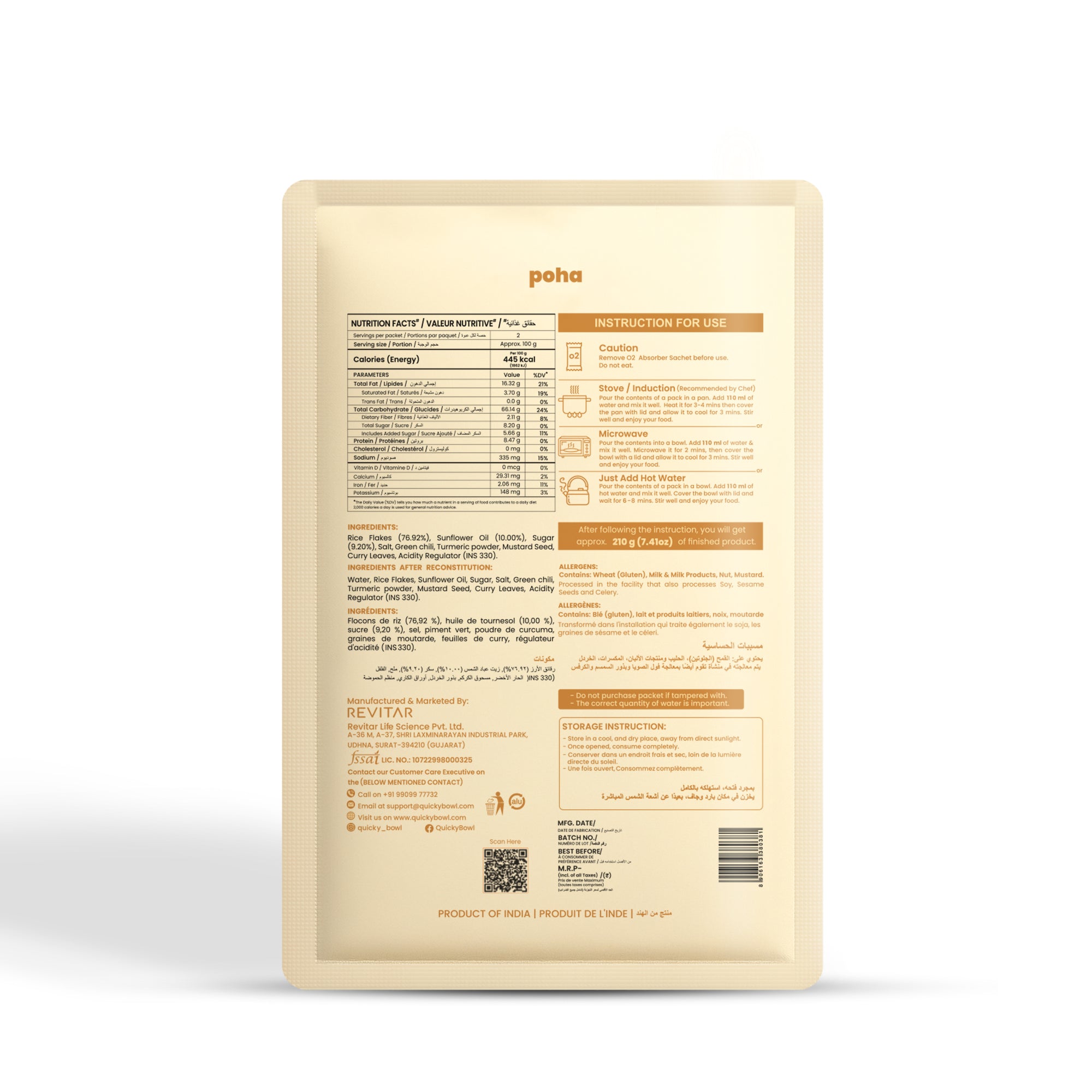 QB ready to eat Poha is a light and healthy dish, making it a popular choice for people who are looking for a nutritious start to their day. Poha is typically made with flattened rice, mustard seeds, curry leaves, turmeric, and peanuts.